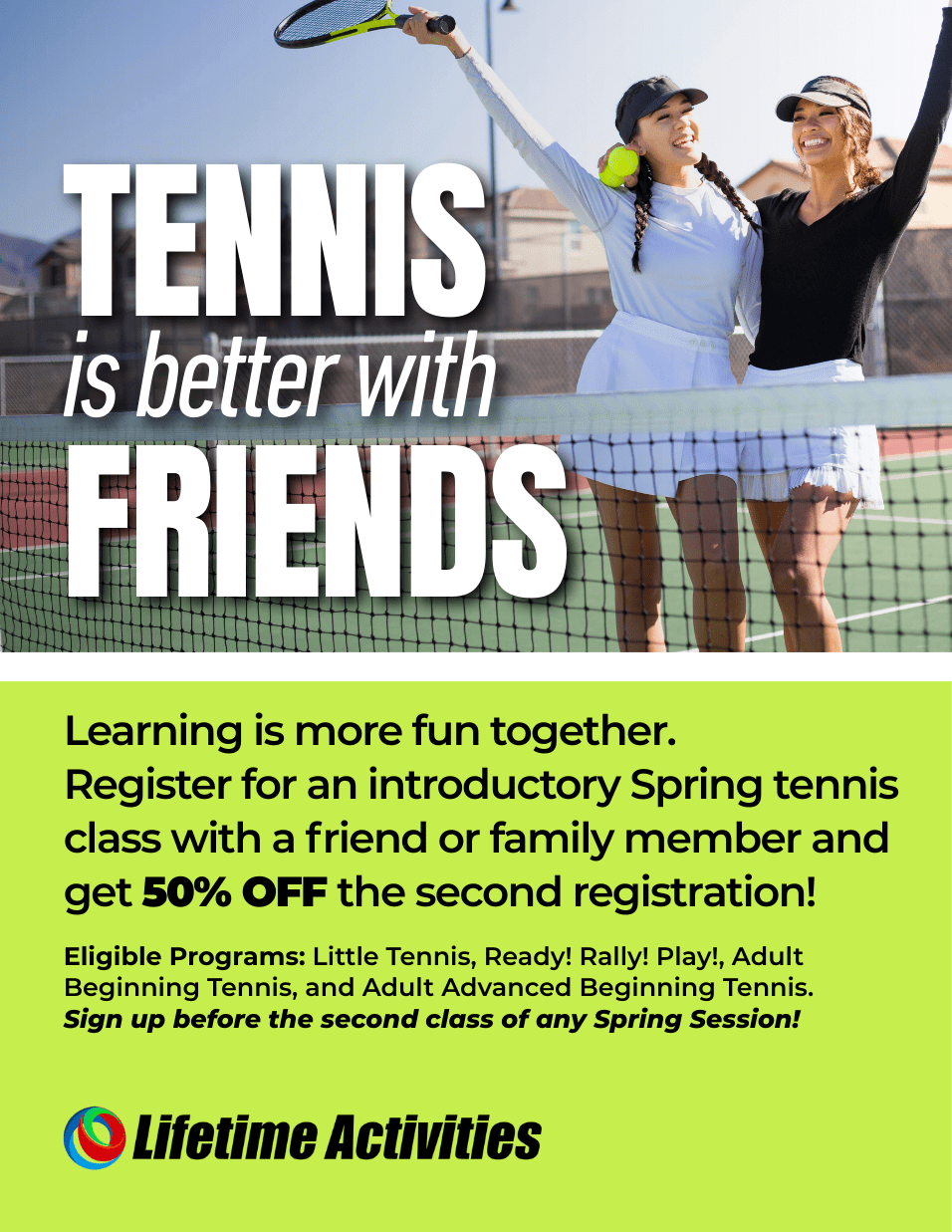 Sign up together for an introductory tennis class and enjoy 50% off the second registration when you enroll in the same class session.