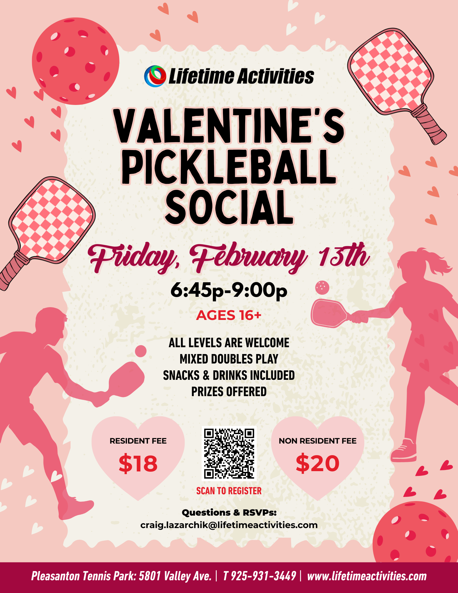 Join us on Friday, February 13th for a fun Valentine’s Pickleball Social! Play pickleball, connect with new players, enjoy food and refreshments, and win fun prizes! Open to all levels, ages 16+. Space is limited— register soon to secure your spot!