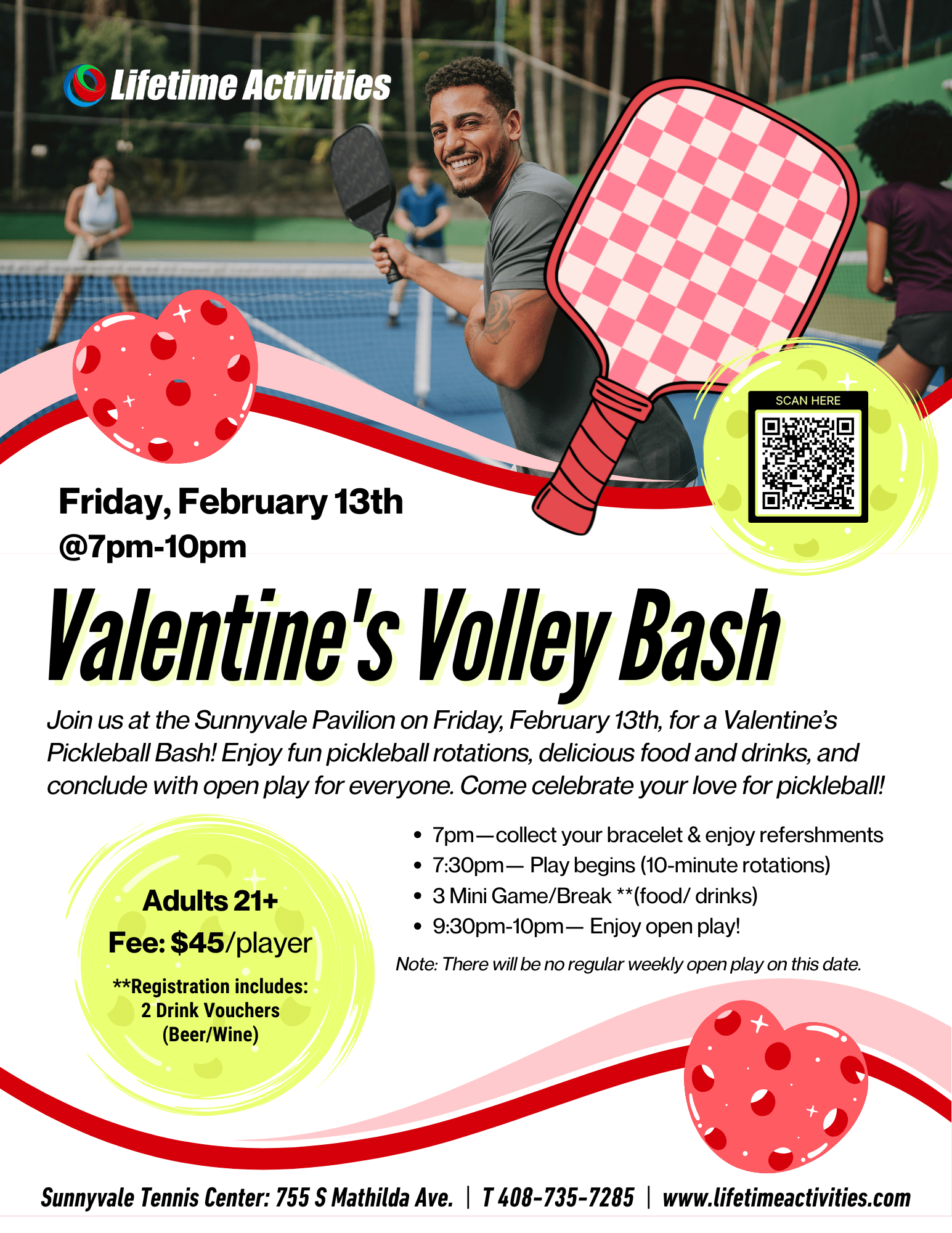 Valentine's Volley Bash Love pickleball? Join us Friday, February 13, for a Valentine’s Pickleball Social! Play, mingle with new players, and enjoy food and drinks in a fun, social setting. Open to adults of all levels, ages 21+. Click HERE to register!